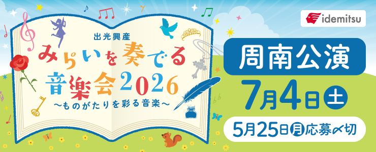 出光興産株式会社(以下「主催者」という)が主催する「みらいを奏でる音楽会2026 周南公演」(以下「本企画」という)に応募される方(以下「応募者」という)は、以下の応募規約(以下「本規約」という)をよくお読みいただき、同意の上でご応募ください。